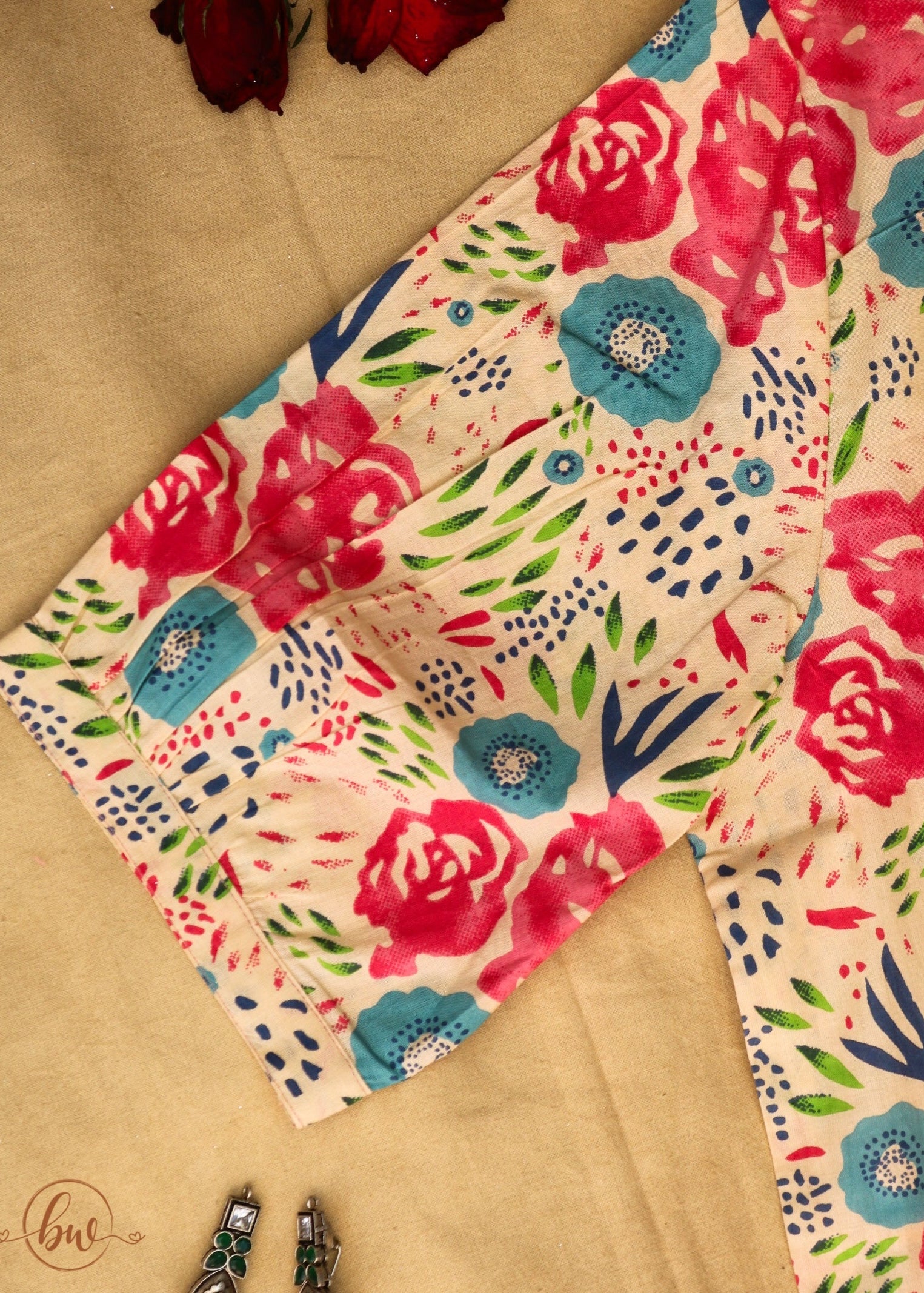 Step into a world of vibrant expression with our "Bohemian Reverie Handblock Cotton Crop Shirt." This captivating crop shirt features a bold and artistic floral pattern in shades of rich pinks, serene blues, and soft creams, creating a look of bohemian charm. Each brushstroke-like design is meticulously handblock printed by skilled artisans, making it a truly unique piece.