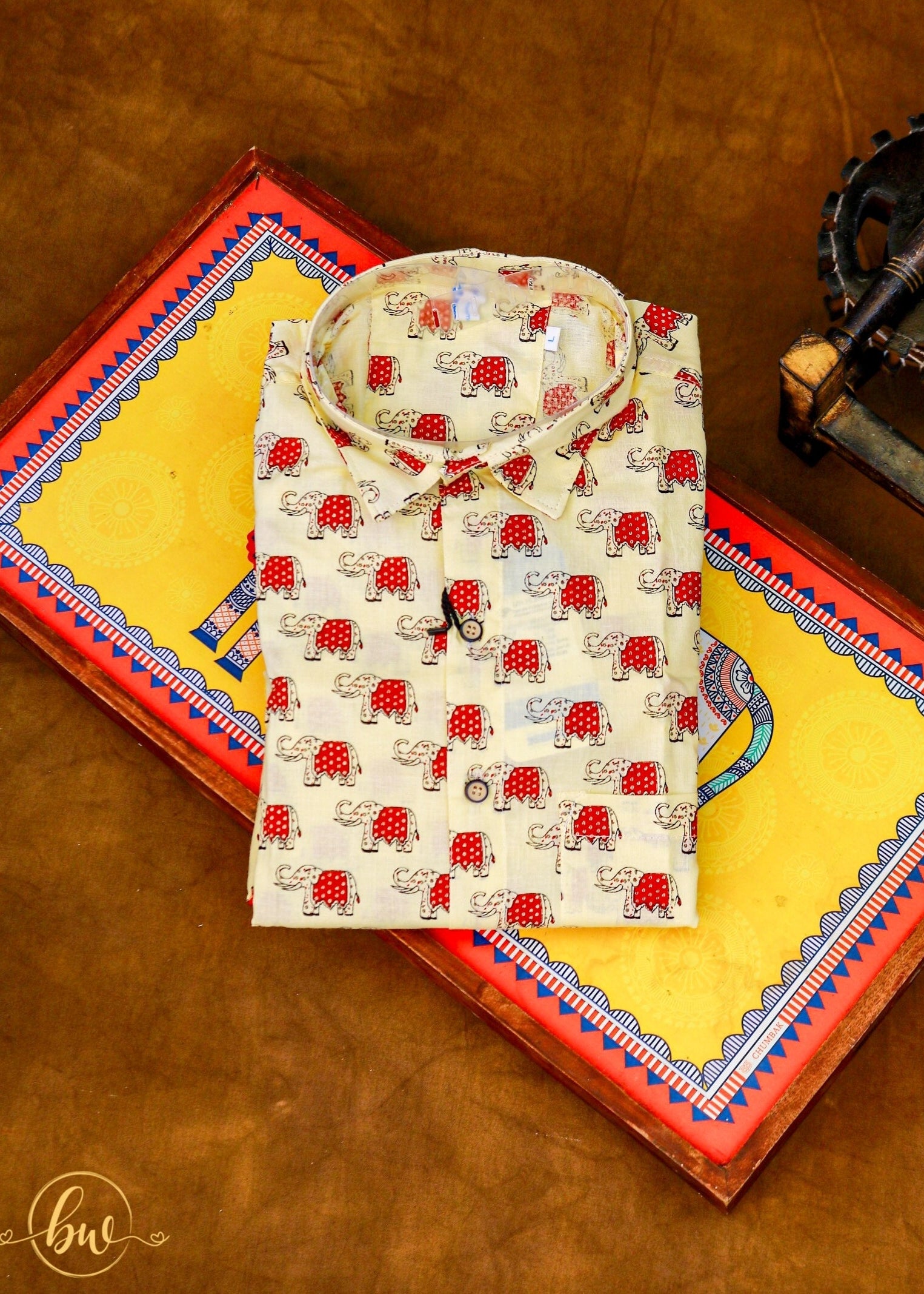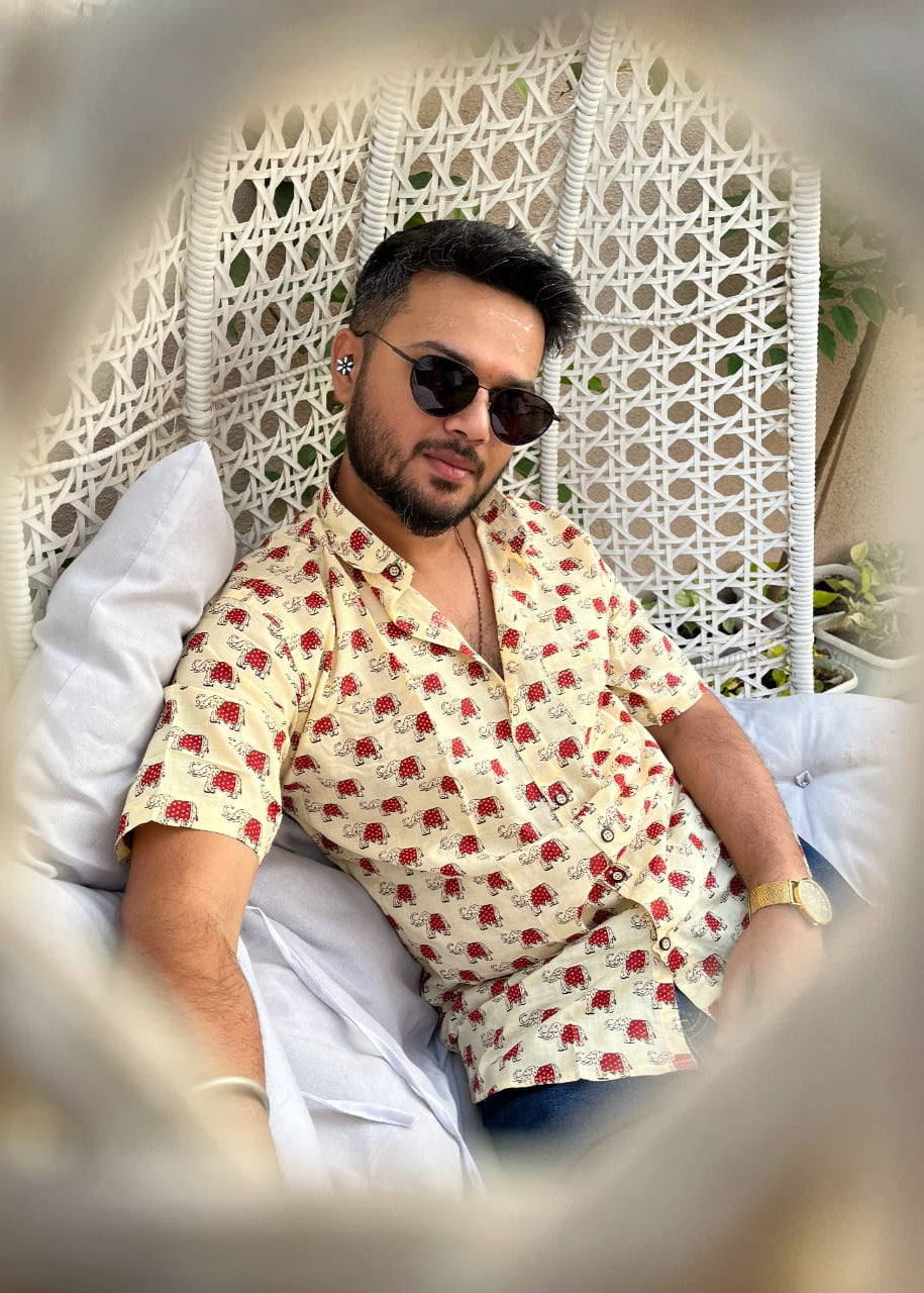 A captivating blue shirt adorned with a playful white elephant print, symbolizing wisdom and grace. Designed with a round flat collar for a touch of classic elegance, the Elephant Essence Shirt is a perfect blend of charm and sophistication ideal for any occasion.