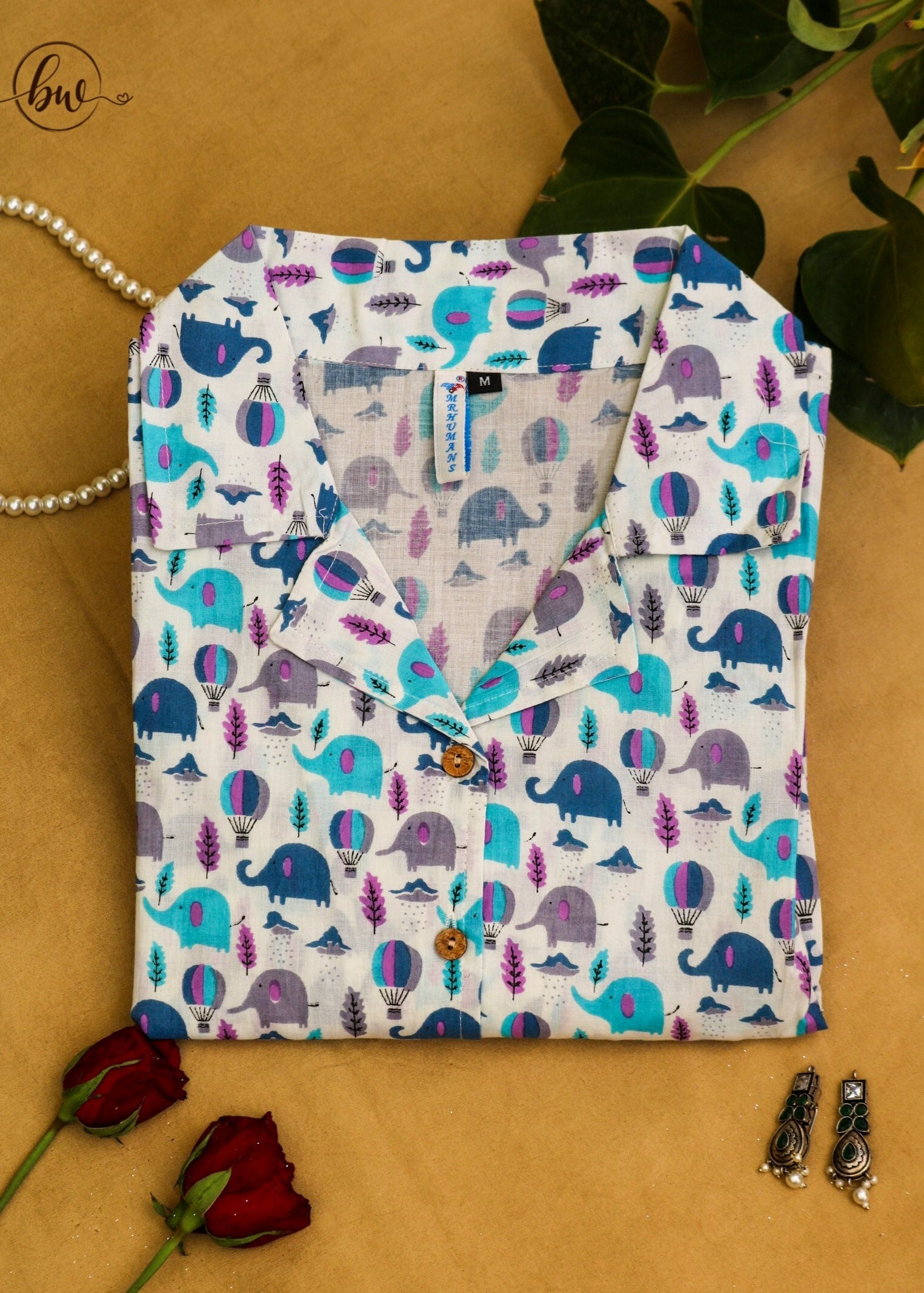 Embark on a whimsical adventure with our "Jumbo Airborne Handblock Cotton Crop Shirt." This unique crop shirt features a delightful print of elephants soaring through the sky in hot air balloons, meticulously handblock printed by skilled artisans. Each elephant and balloon, in soft shades of blue, purple, and gray, brings a touch of playful fantasy to your style.