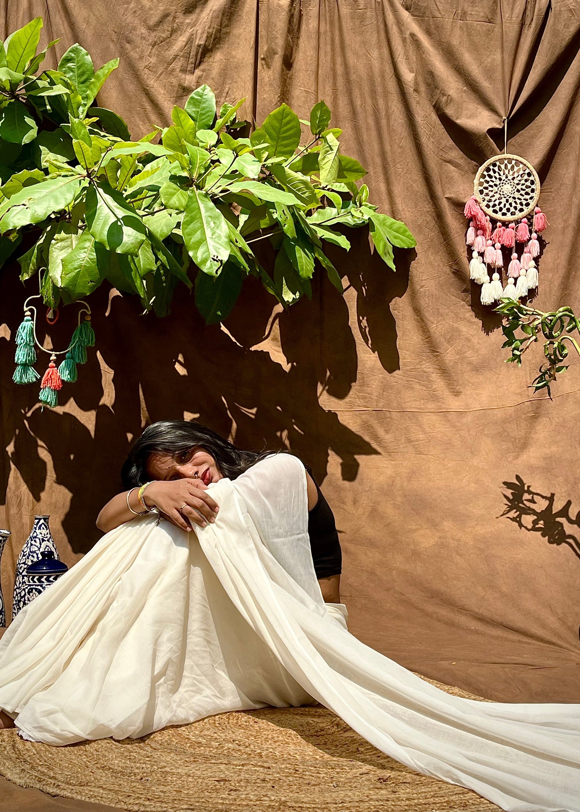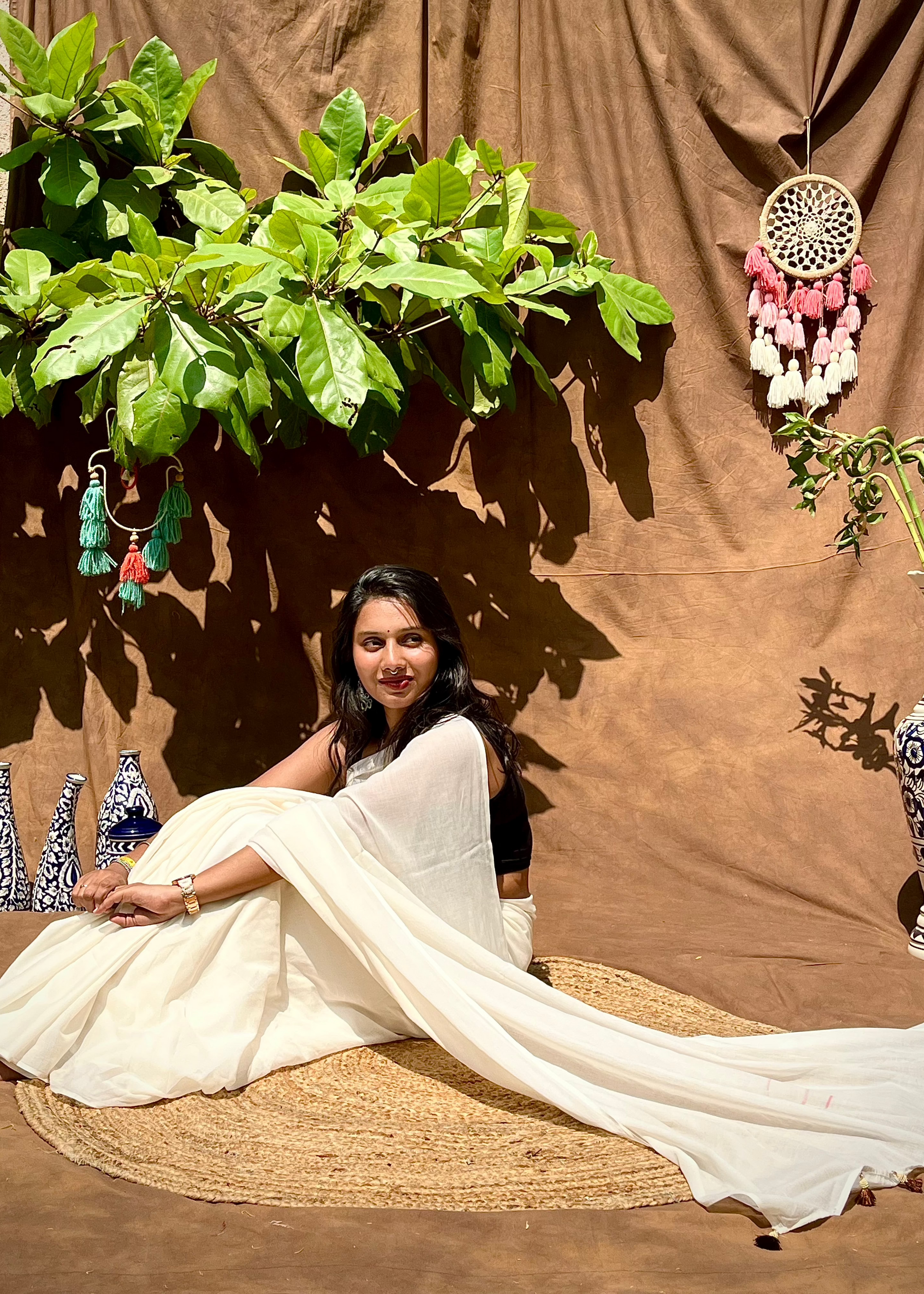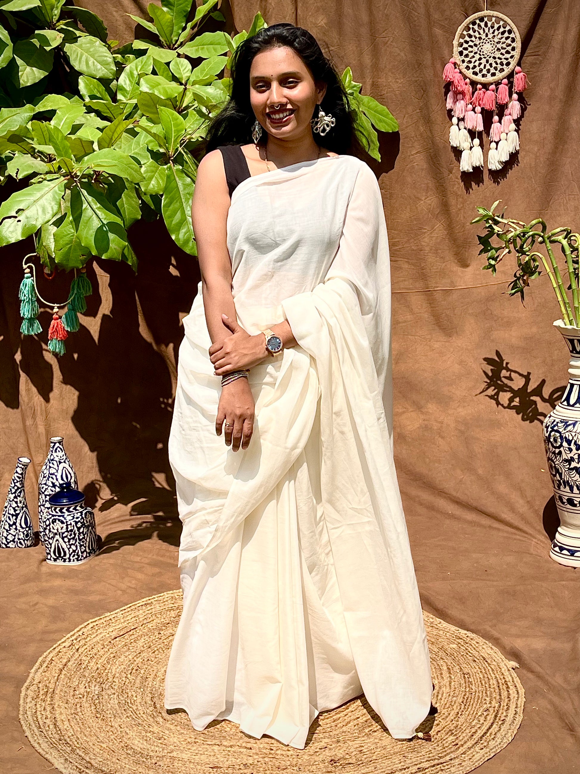 Bathe in the soft, ethereal glow of our "Moonlit Pearl" saree. Crafted from the most delicate mulmul cotton, this saree drapes around you like a gentle whisper, its breathable fabric ensuring a dreamlike comfort that lasts all day. The serene ivory hue evokes the tranquil beauty of a pearl bathed in moonlight, a color that speaks of quiet elegance and timeless romance. Adding a touch of unique artistry is the captivating patchwork blouse piece, where rich dark greens and deep maroons come together in a tapestry of color and texture, hinting at hidden depths and untold stories. As the lightweight fabric flows with your every movement, the delicate tassels at the pallu sway like shimmering droplets, catching the light with a subtle, enchanting dance. Whether you're stepping out for a sophisticated evening or adding a touch of understated grace to a daytime occasion, the "Moonlit Pearl" adapts with effortless charm, making you feel radiantly serene and utterly captivating. Wrap yourself in this moonlit dream and let your inner luminescence shine.